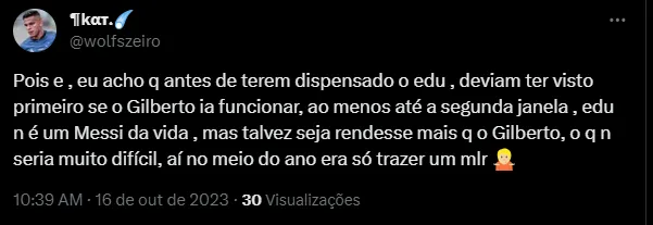 “Gilberto tem contrato com o Cruzeiro até dezembro de 2024 e o pacote incluindo salário, direitos de imagem, luvas e comissão ao seu empresário custa ao Cruzeiro R$ 670 mil por mês, ou seja, se quiser dispensar o Gilberto, o Cruzeiro vai ser obrigado a indenizá-lo ele e seu empresário em mais ou menos R$ 10,5 milhões”, disse Nicola. A última partida de Gilberto pelo Cruzeiro foi há um mês, no duelo contra o Fluminense.