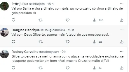 “Está completamente descartada essa possibilidade de uma rescisão de contrato de forma unilateral. A tendência é que o Gilberto treine afastado do restante do elenco até o fim da temporada e o Cruzeiro vai rezar para que apareça um clube interessado em assumir 100% dos custos do jogador. Gilberto já foi especulado nas últimas horas como reforço do Bahia e também do São Paulo antes de gravar o vídeo consultei um dirigente do Cruzeiro que assegura que nenhum clube brasileiro entrou em contato para falar sobre o atacante Gilberto”, finalizou o jornalista.