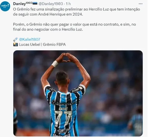 Segundo informações do setorista Kaliel Dorneles, da Rádio Bandeirantes, na tarde desta terça-feira (5), através de sua redes sociais, o Grêmio fez uma sinalização preliminar ao Hercílio Luz que tem intenção de seguir com André Henrique em 2024.