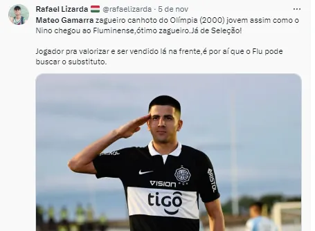 Em suas redes sociais, o jornalista Oswaldo Araújo trouxe a informação de que o Fluminense teria se acertado com um jogador que vinha sendo especulado no Grêmio. Trata-se do zagueiro Mateo Gamarra, do Olímpia, do Paraguai. Ele enfrentou o Flu nas quartas de final da Libertadores e foi um dos destaques da equipe paraguaia na competição.