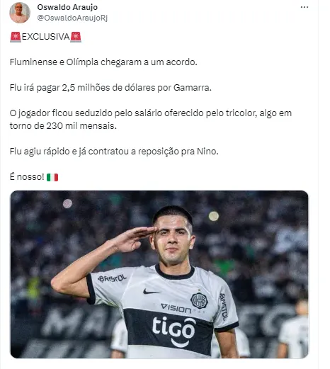 O comunicador começou sua informação destacando os valores do negócio pelo jovem zagueiro paraguaio. “Fluminense e Olímpia chegaram a um acordo. Fluminense irá pagar 2,5 milhões de dólares (R$ 12 milhões) por Gamarra”.