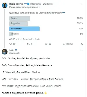 Apesar disso, a equipe já pensa na próxima janela de transferências visando reforçar o elenco para a próxima temporada. Com isso, alguns nomes já vêm sendo especulados no Tricolor Gaúcho. Vale lembrar que existe muita expectativa para saber o que acontecerá com o time após a saída de Renato Gaúcho.