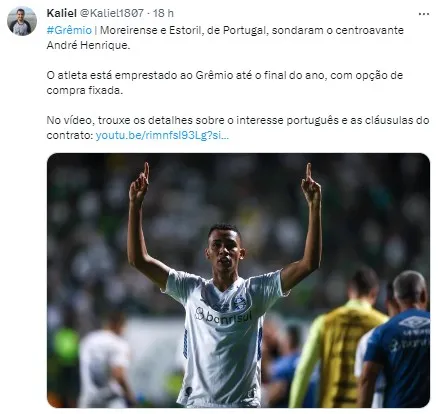 “Moreirense e Estoril, de Portugal, sondaram o centroavante André Henrique. O atleta está emprestado ao Grêmio até o final do ano, com opção de compra fixada”, publicou Kaliel em seu perfil oficial no Twitter.