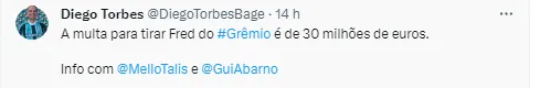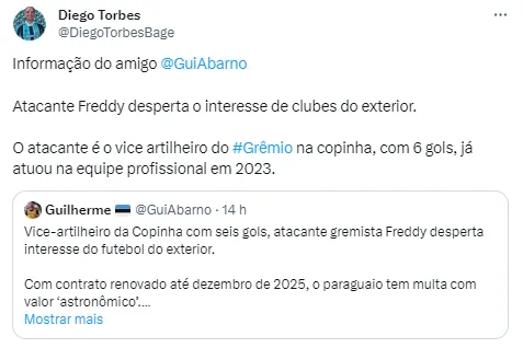 “Atacante Freddy desperta o interesse de clubes do exterior. O atacante é o vice artilheiro do Grêmio na Copinha, com 6 gols, já atuou na equipe profissional em 2023. A multa para tirar Freddy do Grêmio é de 30 milhões de euros”, completou Diego Torbes.
