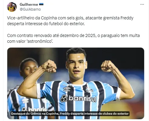 “Vice-artilheiro da Copinha com seis gols, atacante gremista Freddy desperta interesse do futebol do exterior. Com contrato renovado até dezembro de 2025, o paraguaio tem multa com valor ‘astronômico’”, iniciou o colega Guilherme Abarno.
