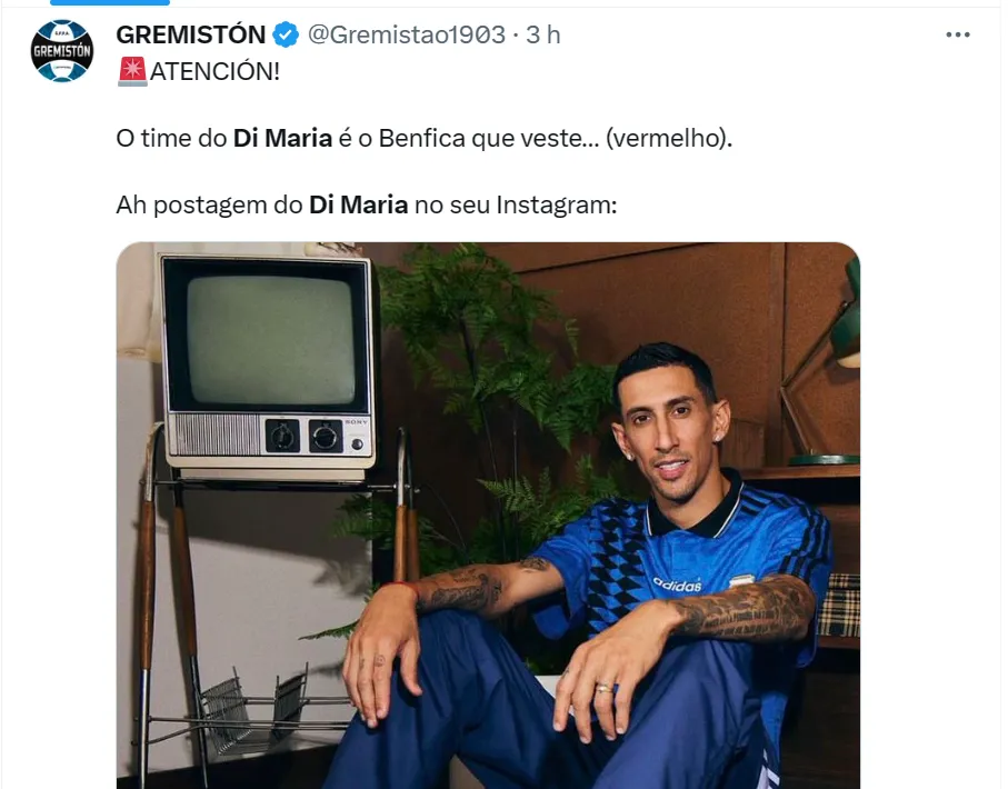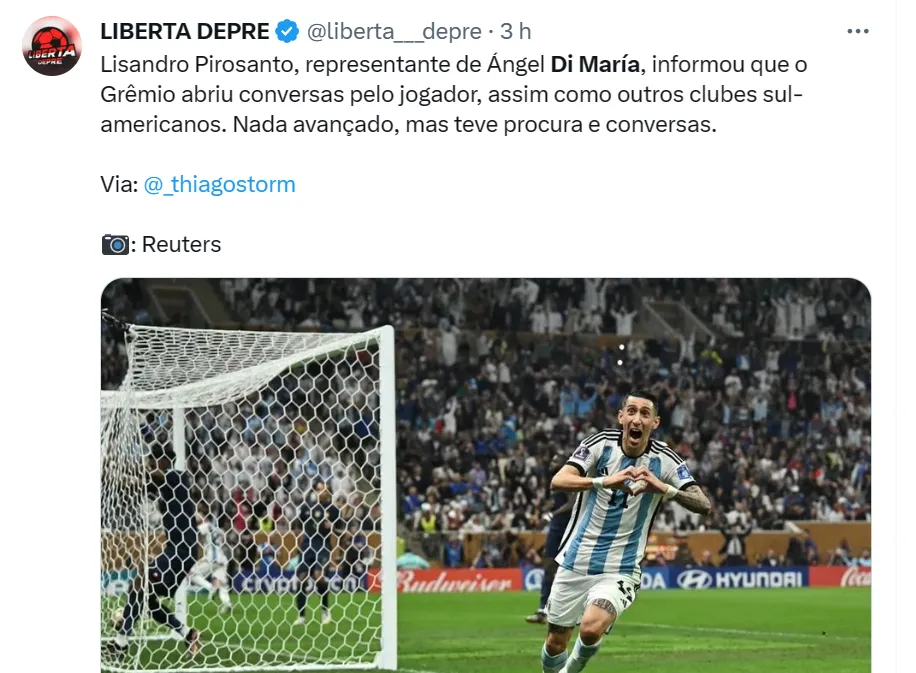 “Em conversa com Lisandro Pirosanto, representante de Di Maria, recebi o seguinte: Grêmio abriu conversas, assim como outros clubes sul-americanos. ‘Nada avançado, mas teve procura e conversas'”, confirmou o colega Thiago Stormovski, que cobre o Grêmio.