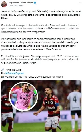 Segundo a apuração, o Inter Miami, equipe que conta com Lionel Messi, teria oferecido uma proposta de R$ 2 milhões mensais para ter Éverton Ribeiro a partir do ano que vem. O time dos EUA se movimentou e trouxe nomes como os experientes Busquets e Jordi Alba, além da promessa sul-americana Facundo Farias.