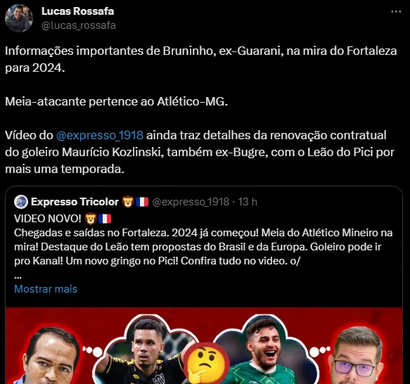 Segundo o repórter Lucas Rossafa, o Fortaleza tem interesse na contratação de Bruninho para a próxima temporada. Vale destacar que o Galo tinha opção de vender 50% dos direitos do jogador por 500 mil euros (R$ 2,67 milhões).