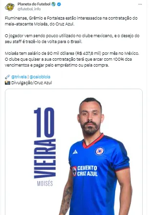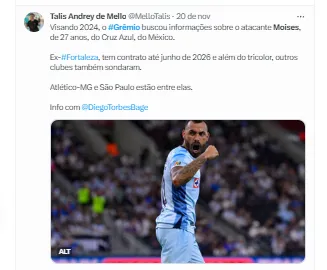 Segundo informações apuradas e trazidas em primeira mão pelo jornalista João Batista Filho, o atacante Moisés, um dos alvos do Tricolor Gaúcho no mercado, teve seus valores revelados. Para a contratação, o Cruz Azul quer algo na casa dos R$ 20 milhões.