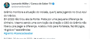 “Por tudo isso, agora, até terá chance de rolar negociação, mas tem que ser perto destas cinco milhas de dólares. Há quem diga que precisa ser, no mínimo, mais de US$ 4 milhões”, informou o jornalista, que cobre o futebol do RS.