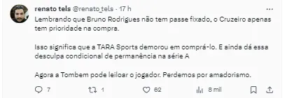 “Em conversas informais, o Cruzeiro procurou o Tombense e sinalizou o desejo de seguir com o atacante Bruno Rodrigues na próxima temporada. No entanto, o clube pediu um tempo até que exista uma definição sobre a permanência ou não na Série A 2024’’, publicou o perfil ConexãoCEC no X, antigo Twitter.
