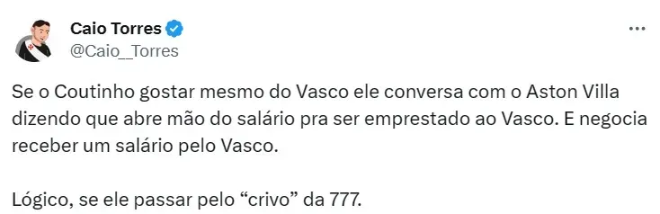 Em 2022, o Aston Villa, da Inglaterra, comprou Coutinho por 20 milhões de euros (R$ 105 milhões na cotação da época) e só aceita negociar o brasileiro por algo próximo ao que foi investido.