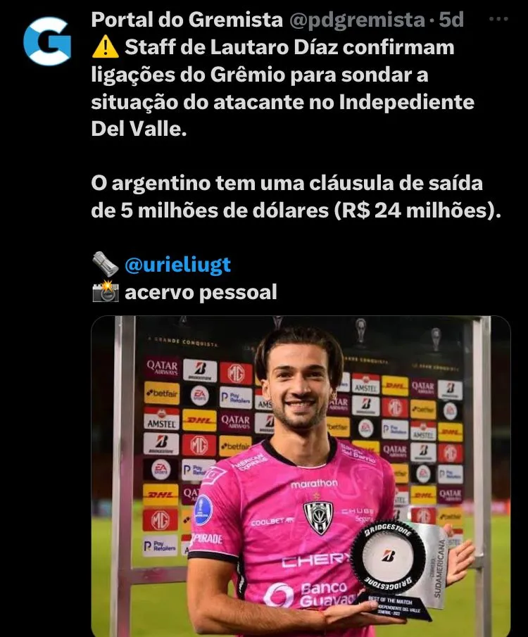 Segundo apurou a reportagem, Lautaro Díaz tem multa rescisória de 5 milhões de dólares (R$ 24,5 milhões) e o Independiente del Valle não estaria disposto a liberá-lo por um valor inferior.