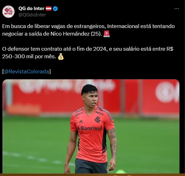 De acordo com o portal Revista Colorada, o plano da diretoria é negociar o zagueiro Nico Hernández, que alternou entre titular e reserva na última temporada e recebe R$ 250 mil mensais.