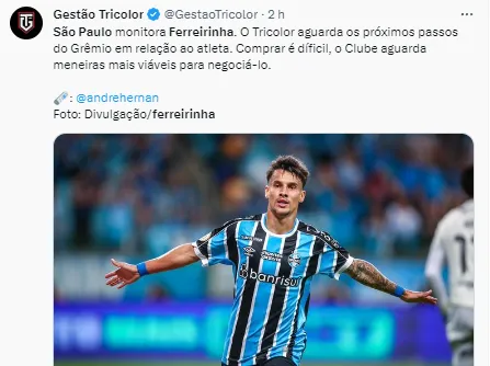 No que diz respeito a temporada de 2024, um nome do atual elenco gremista que está na mira do mercado e pode deixar a equipe no fim deste ano. O atacante Ferreirinha vem sendo alvo de algumas especulações e pode sair do Tricolor.