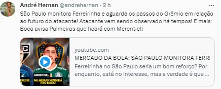 Segundo o setorista do Grêmio, na Rádio Bandeirantes, o jogador tem status de negociável na equipe. “O atacante Ferreira é um dos primeiros nomes na lista dos jogadores que o Grêmio pretende negociar em 2024. O entendimento interno é que a relação custo-benefício está no negativo, tendo em vista que o atleta recebe um alto salário”.