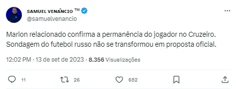 Se trata de Marlon, que chegou a atrair o interesse do Dínamo Moscou. O Clube Russo estaria disposto a pagar 5 milhões de euros pelo lateral-esquerdo, cerca de R$ 26,5 milhões na cotação. Entretanto, a partir da informação do jornalista Samuel Venâncio, a torcida da Raposa descobriu que contará com o defensor por mais tempo. O defensor foi relacionado para o jogo contra o Santos, o que prova a continuidade do trabalho.