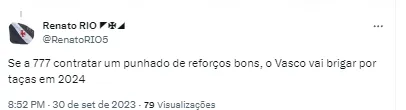 Já pensando em 2024, o Vasco quer montar um elenco forte para a temporada que estar por vir e o planejamento de aportes da 777 Partners. A empresa que gere a SAF do Gigante da Colina, irá aportar R$ 270 milhões em 2024 no Clube e segundo o jornalista que cobre o Vasco, Fábio Azevedo, isso pode ajudar o time na primeira janela de transferências do ano que vem.