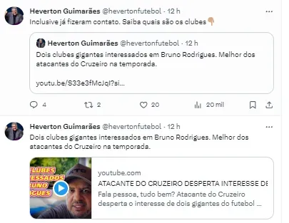 Vale lembrar que de acordo com informações apuradas e trazidas pela equipe de reportagem da Rádio Itatiaia, que cobre o Cruzeiro, o atacante Bruno Rodrigues recebeu uma proposta do Al-Taawon, da Arábia Saudita, de 4 milhões de euros (R$ 21 milhões na cotação atual).