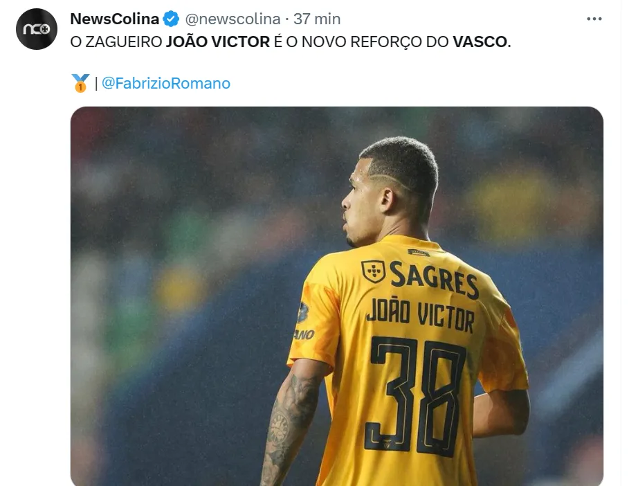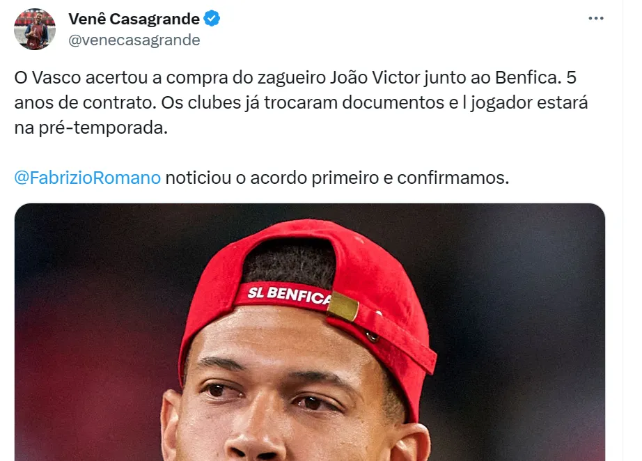 Segundo apuração do jornalista Venê Casagrande, do SBT Rio, o Vasco acertou a vinda do zagueiro João Victor, do Benfica. Com o investimento da 777 Partners, o Cruz-Maltino traz o beque de 25 anos por cinco temporadas (até dezembro de 2028).