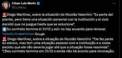 Assim, ele poderia fechar com qualquer equipe sem custos de operação. Porém, por causa disso, segundo Jorge Nicola, Nicolás Valentini foi afastado da equipe, pois os hermanos querem que ele aceite a renovação. Esse imbróglio pode ser positivo para o Grêmio no mercado.