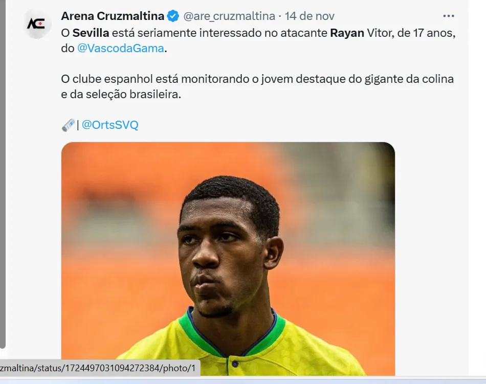 O jornalista espanhol Fernando Serrano informa que o Sevilla, heptacampeão da UEFA Europa League, está muito interessado no atacante Rayan, uma das maiores joias do Vasco nos últimos anos.