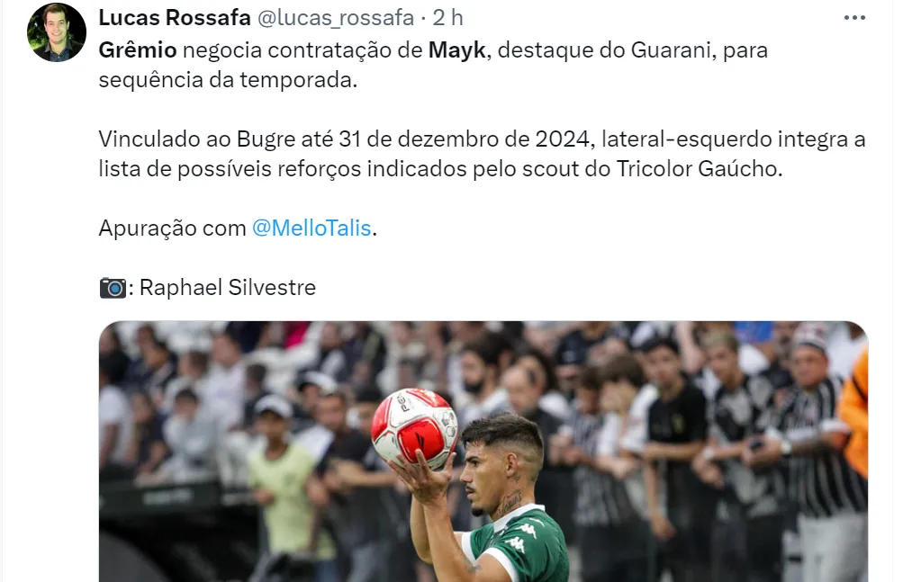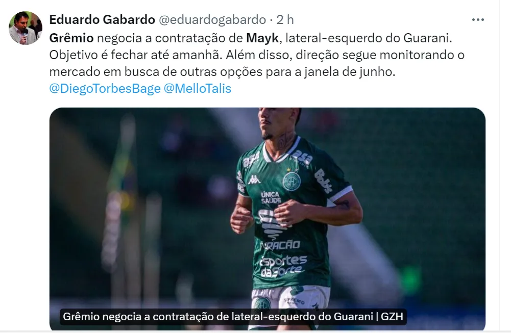 Os setoristas Eduardo Gabardo, Diego Torbes e Fabíola Thiele apuraram que o Grêmio encaminhou a contratação do lateral-esquerdo Mayk, revelação do Guarani. O jogador de 24 anos foi revelado pelo América-RN e teve passagens por Bahia, Joinville e Retrô.