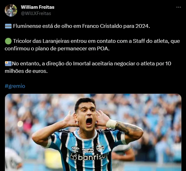 Segundo o jornalista, caso uma proposta chegue na casa dos dez milhões de euros (R$ 53 milhões), o Grêmio deve liberar Cristaldo, que é um dos jogadores importantes no elenco comandado por Renato Gaúcho, sendo titular do meio-campo do Imortal.
