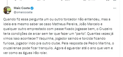 “Segundo ele, os preços estabelecidos são definidos dentro de condições que o clube pode arcar. Quando fiz essa pergunta um ou outro torcedor não entendeu, mas a ideia era mesmo saber se caso Matheus Pereira, João Marcelo e qualquer outro emprestado com passe fixado jogasse bem, o Cruzeiro teria condições de arcar sem ter que fazer um parto”, completou Maic Costa.