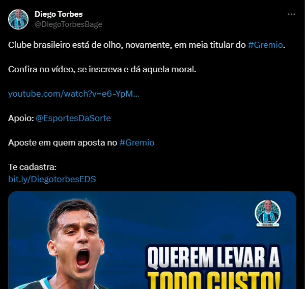 “O Palmeiras nesta semana, na quarta-feira, procurou o empresário do jogador para saber da possibilidade. O Palmeiras estaria disposto a pagar pelo passe para a utilização em 2024, pelo fechamento da janela. O que eu soube, que chegou atè mim, é que estão dispostos a pagar pelo passe do jogador e ofereceu o dobro do salário que ele ganha no Grêmio. O Cristaldo não tem intenção de sair do Grêmio, mas deixa nas mãos do empresário essa questão”, disse Diego Torbes, em seu canal no YouTube.