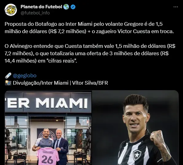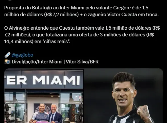A bola da vez no Botafogo é o volante Gregore, do Inter Miami, clube dos astros internacionais e campeão da Leagues Cup, segundo André Hernan. A proposta do Fogão gira em torno de 1,5 milhão de dólares (R$ 7,2 milhões), mais Cuesta.