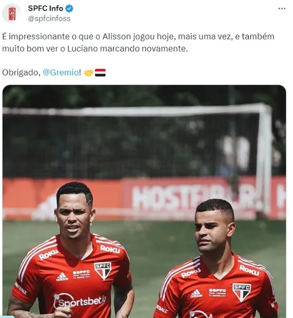 Enquanto isso, em alta nesta temporada, o São Paulo acertou a renovação de contrato de Alisson até 31 de dezembro de 2026 (o antigo era válido até o fim de 2024). Nesse novo acordo, o Grêmio não terá que fazer nenhum tipo de pagamento ao jogador.