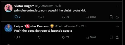 “Eu acho que o Pedrinho é que tem que dar essa novidade para vocês (…) Em breve vocês vão saber. (…) Acho que errei em falar. (…) Pedrinho é um cara sensacional. (…) E por que não ele, um dia, possa matar no peito e comprar o Cruzeiro? Ele pode”, revelou Marcelo Moreno.