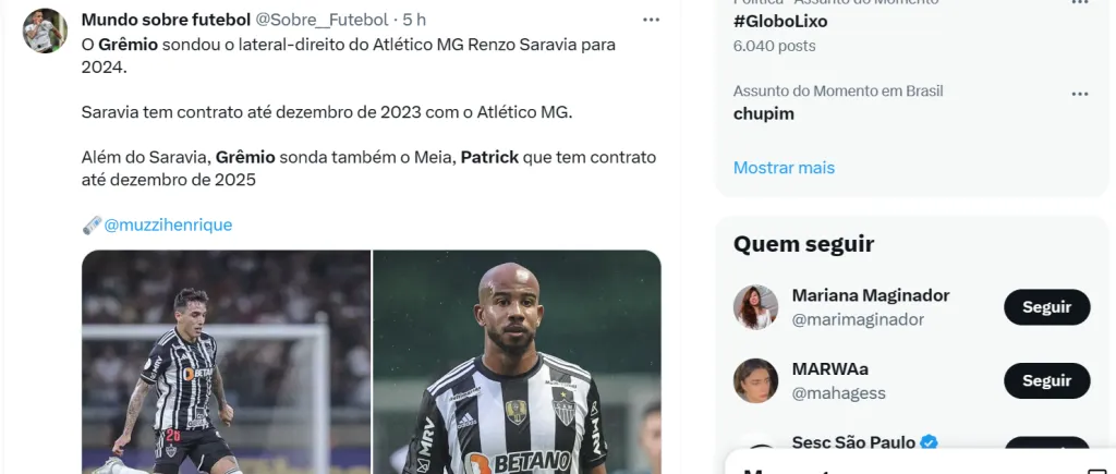 O Atlético-MG vem sendo um alvo bastante ativo dos gaúchos, que sondaram o staff do lateral-direito Renzo Saravia nos últimos dias. Entretanto, de acordo com o canal Bica Galo, o lateral deve renovar em Belo Horizonte.