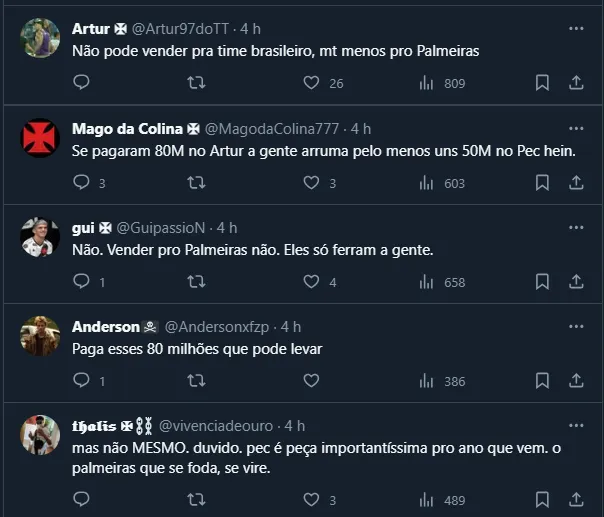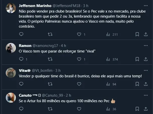 Assim, além de ser o atual campeão nacional, o Palestra está com dinheiro em caixa e a torcida do Vasco já está “com medo”. Não à toa, vários torcedores foram às redes sociais e se manifestaram contrários à venda para o Verdão.