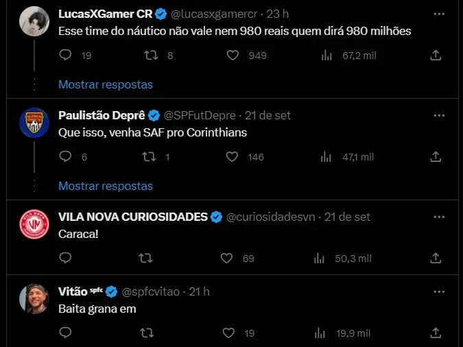 O site MKT Esportivo dá conta que, na Série C do Brasileirão, o Náutico pode ser negociado por cifras que beiram a casa do R$ 1 bilhão: “Negócio envolve plano de investimentos e custos garantidos que podem, dependendo de êxitos dentro de 10 anos, chegar a R$ 980 milhões pela compra de 90%”, destaca a publicação.