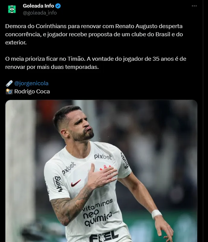 Conforme apurado, Renato Augusto é um nome que agrada tanto os dirigentes quanto a comissão técnica gremista. Além disso, o ‘xodó’ de Tite na Seleção Brasileira tem seu acordo com o Timão se encerrando no final deste ano, possibilitando assim, que o jogador chegue sem custos à Porto Alegre.