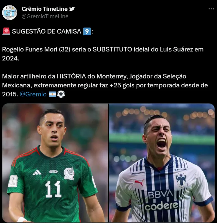 O jogador em questão é Rogelio Funes Mori. O centroavante de 32 anos atualmente está no Monterrey, mas tem seu contrato se encerrando com o clube mexicano no meio do próximo ano. Com isso, o camisa 9 estaria apto a assinar um pré-acordo no final de 2023/início de 2024. Desse modo, uma quantia simbólica poderia ser oferecida para ele chegar em Porto Alegre de imediato.