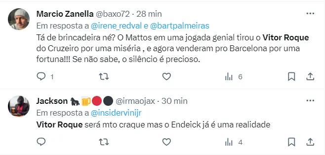 “O Barça jogou a toalha e descarta a chegada de Vítor Roque em janeiro no momento. As dificuldades financeiras do clube acabaram prevalecendo e parece que o brasileiro não conseguirá se inscrever neste inverno (janeiro). Seria necessário abrir espaço na folha salarial, o que é muito difícil de conseguir no momento”, informou a reportagem da rádio.