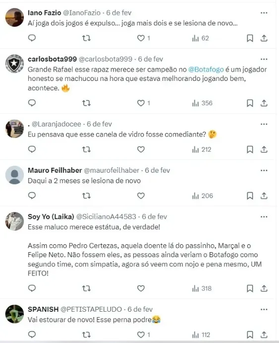 “Quero agradecer a Deus, à minha família toda, me deram muito apoio, o psicólogo do clube, meu terapeuta. Não foi fácil. Tenho que engradecer eles, foi um momento muito difícil. Todos os médicos do clube, funcionários… Foi um momento muito difícil, mas eu superei. Espero ajudar o Botafogo o máximo possível para conquistar um título e chegar o mais longe possível“, disse Rafael, à BandSports.