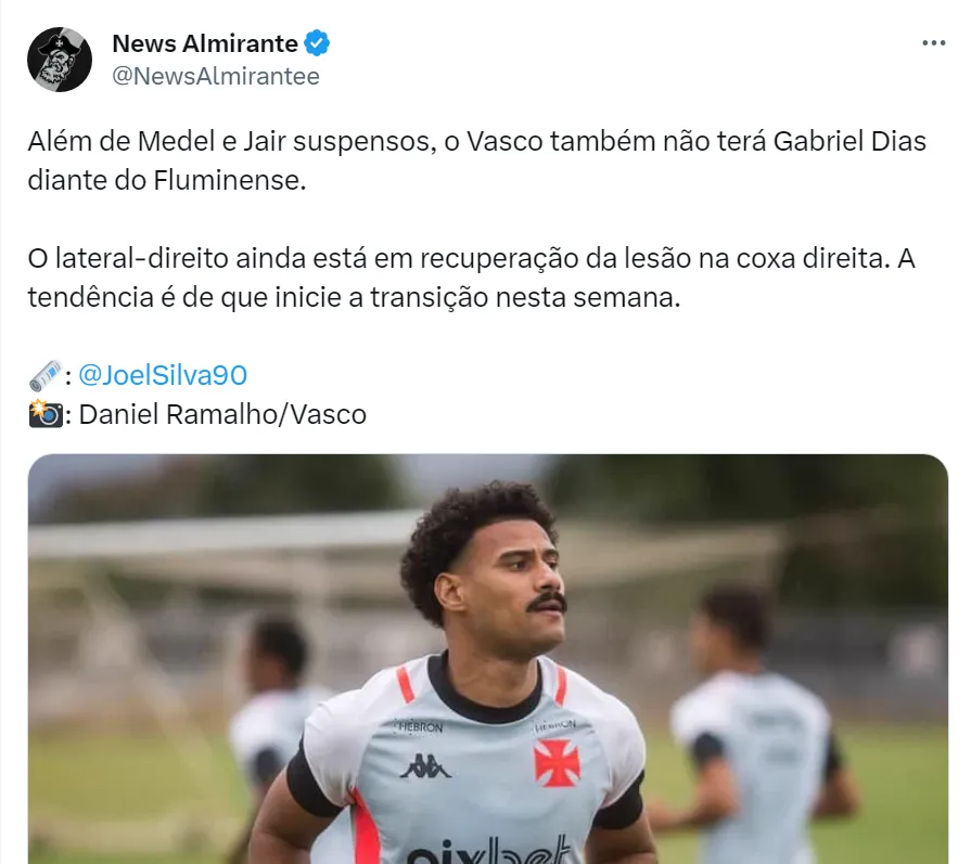 De acordo com o Lance!, o lateral-direito Gabriel Dias, que se machucou na vitória contra o Atlético-MG, no dia 20 de agosto, ainda não vai estar à disposição na próxima rodada do Brasileirão. Ele se recupera de uma lesão de grau 2 no músculo posterior da coxa direita e deve iniciar a transição física apenas na próxima semana.