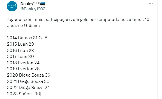 Suárez, inclusive, segue sendo um dos principais nomes do Tricolor de Porto Alegre na temporada. O uruguaio é o que mais participou de gols do Imortal na temporada, com 30. Os números chamam muito a atenção, afinal ele só fica atrás de dois jogadores neste quesito em uma única temporada: Diego Souza, 2020 com 36, e o argentino Hernán Barcos, em 2014 com 31. No entanto, a chance dele ultrapassar a dupla é grande.