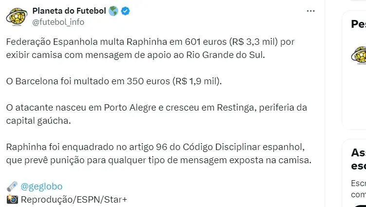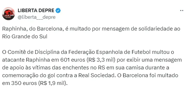 Nesta terça-feira (14), o atacante Raphinha foi multa pelo Comitê de Disciplina da Federação Espanhola. O jogador do Barcelona foi multa pela mensagem de apoio ao Rio Grande do Sul.