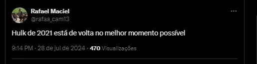 Após a partida, vários torcedores usaram as redes sociais para exaltar os gols marcados pelo atacante. Vale lembrar que esse é o segundo domingo que Hulk decide para o time, já que ele marcou na vitória contra o Vasco da Gama.