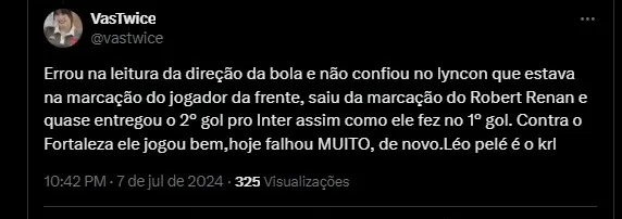 Errou na leitura da direção da bola e não confiou no Lyncon que estava na marcação do jogador da frente, saiu da marcação do Robert Renan e quase entregou o 2° gol pro Inter assim como ele fez no 1° gol. Contra o Fortaleza ele jogou bem,hoje falhou MUITO, de novo.Léo pelé