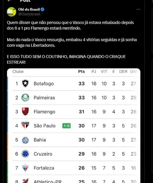 Outro comentário, foi um dos perfis recordando a derrota de 6 x 1 do Flamengo, lembrando que naquela época ninguém acreditava na equipe do Vasco. Com a vitória, o Cruzmaltino está na nona colocação do Brasileirão vivendo o melhor momento no ano.