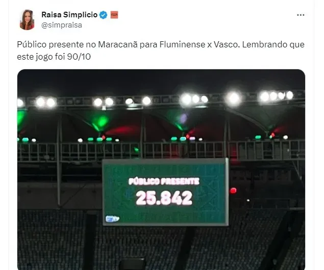 “Público presente no Maracanã para Fluminense x Vasco. Lembrando que este jogo foi 90/10”, afirmou a jornalista do GOAL no X.