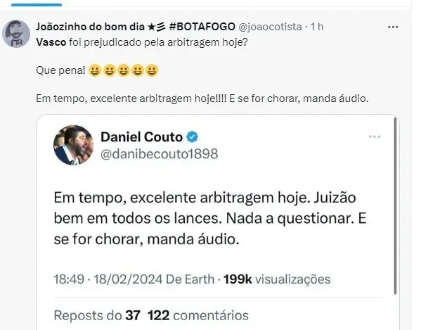 Em tempo, excelente arbitragem hoje!!!! E se for chorar, manda áudio”, postou um torcedor na rede social X.