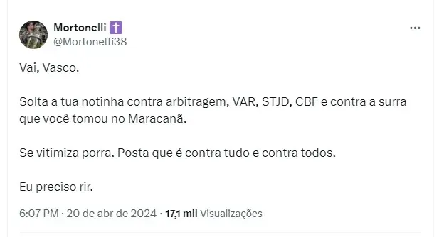 Eu preciso rir”, afirmou o torcedor Mortinelli após o clássico no X.