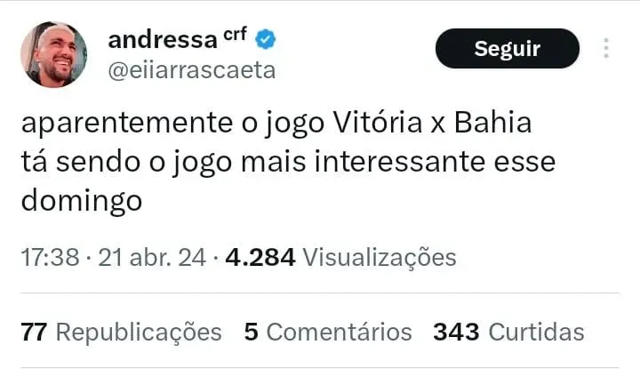 ”Aparentemente o jogo Vitória x Bahia tá sendo o jogo mais interessante esse domingo”, disse um torcedor no X.
